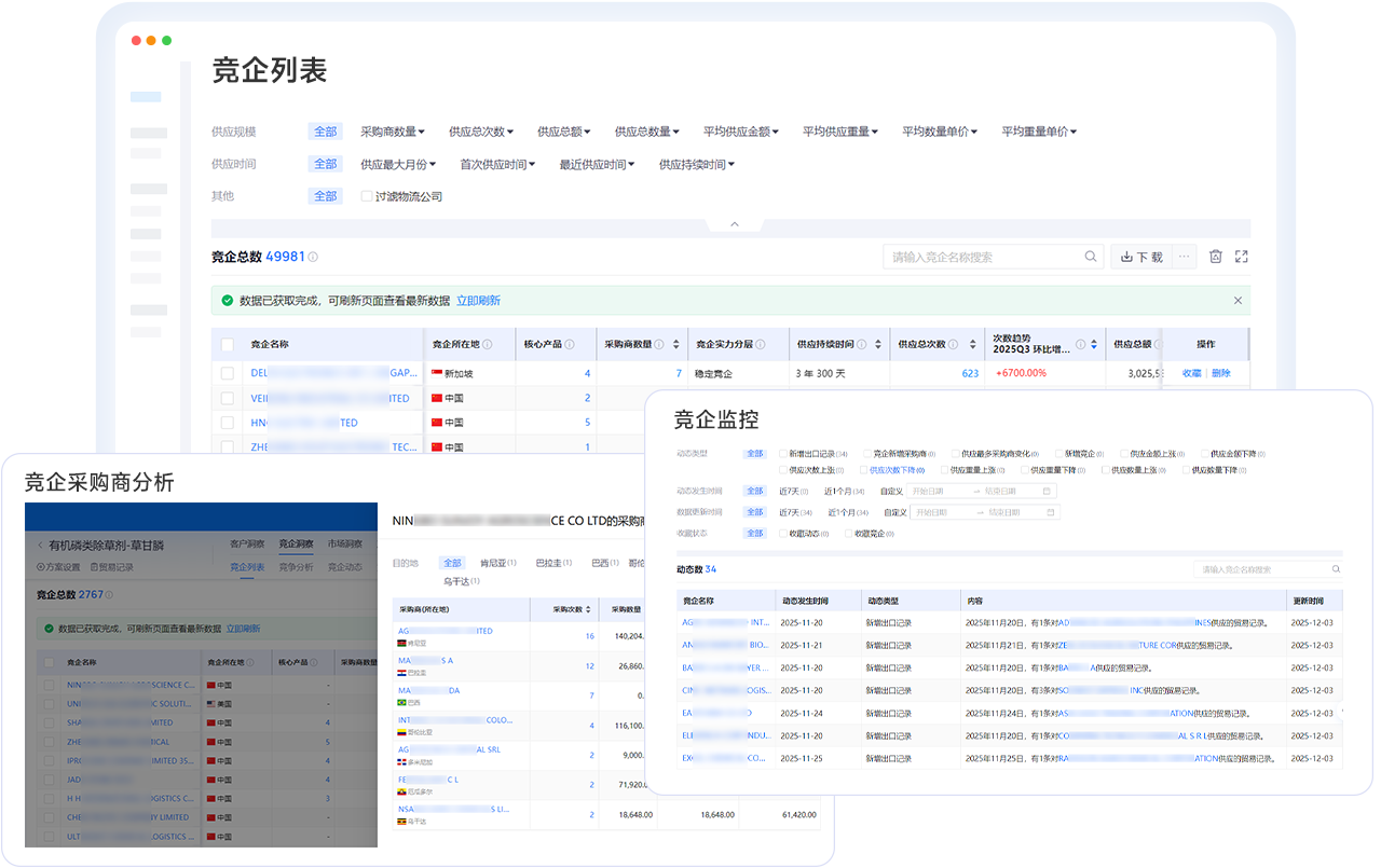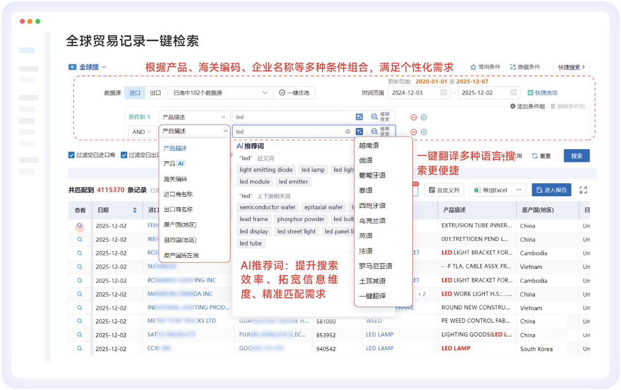 依托AI全新打造的智能、精准的高价值客户开发利器,给予具备全球视野的市场洞察、潜客获取、竞企监测、客户分析等一站式服务